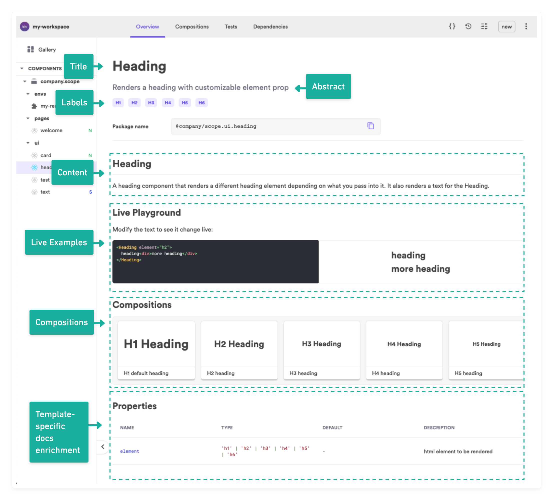 For example, the following ui/card component will have its docs file, card.docs.mdx automatically loaded. The docs file will be rendered in the 'Overview' section, using the docs template set by that component's Env.