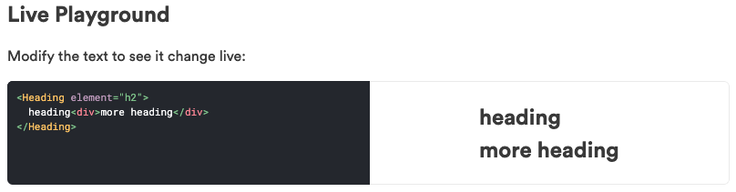 import { Heading } from './heading'; ```jsx live <Heading element="h2"> heading<div>more heading</div> </Heading> ```
